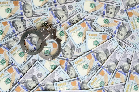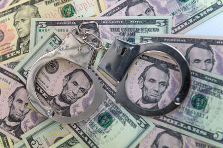 handcuffs on money background, dollar bills, money cash corruption, dirty money financial crime and metal police handcuffs, selective focus