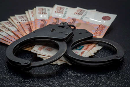 Many five thousand Russian money banknotes lie in a fan on a wooden table background with black police handcuffs. The concept of economic crime, theft or robbery.