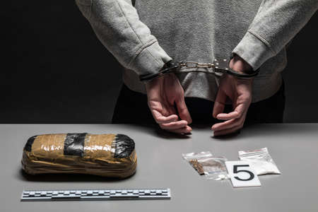 hands of a male drug dealer are handcuffed. The fight against drugs and crime.