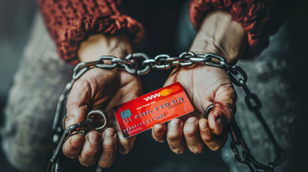A person is holding a credit card with a chain around their neck, symbolizing debt slavery.