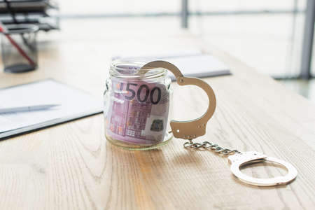 glass jar with euro banknotes and handcuffs near blurred document, anti-corruption concept