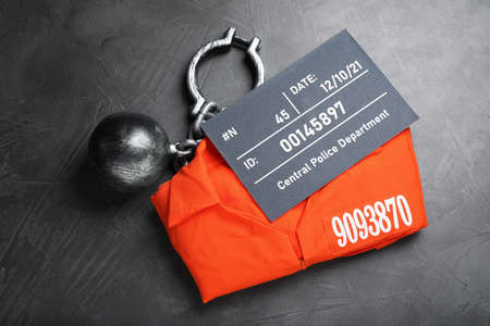 Metal ball with chain, prison uniform and mugshot letter board on gray table, flat lay