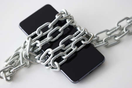 White smartphone with a large metal chain on a white background. Digital detoxification, dependence on technology, lack of concept of gadgets and devices.Place for copy space