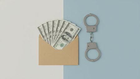 Envelope filled with us dollar banknotes next to metal handcuffs on a split background, illustrating concepts of corruption, bribery, fraud, and legal consequences