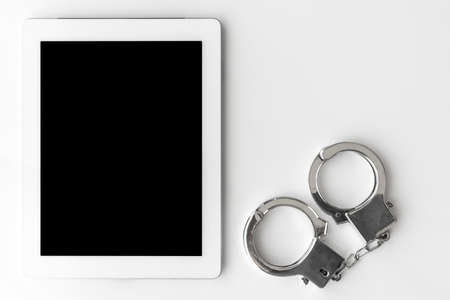 Cyber crime legal law police handcuffs on a hundred dollar bills with computer keyboard technology of criminal taking fingerprint on paper
