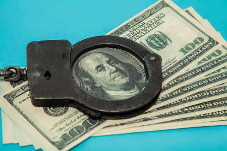 Handcuffs for money. Close-up of handcuffs on a hundred banknotes. Handcuffs on the background of money, business security concept. Stack of currency cash and handcuffs on blue background