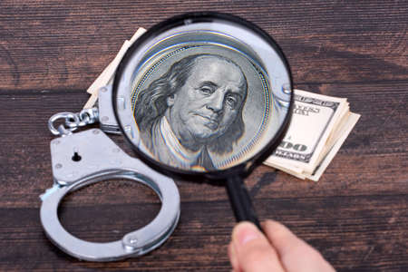 Handcuffs on a wad of dollars through a magnifying glass, Benjamin Franklin close-up.