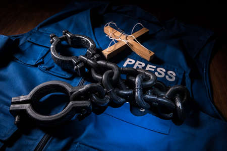 Media Journalism fake news concept. Blue journalist (press) vest in dark with backlight and fog. Dirty money on journalist vest. Selective focus