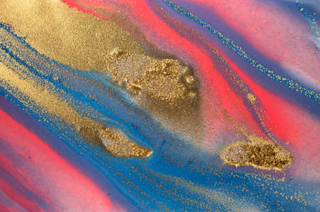 Mixed paints art. Abstract design background. Blue gold black glitter ink blend