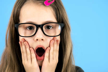 Portrait of surprised child girl wearing looking glasses holding hands to her face isolated on blue background.