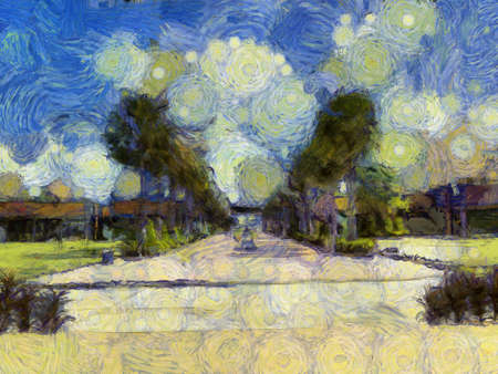 Landscape of park walkway with tall palm trees Illustrations creates an impressionist style of painting.