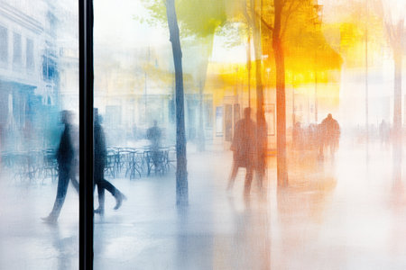 Blurred silhouettes of people mingled with distorted reflections of buildings all caught in the gl mirrors.