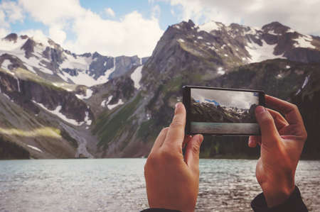 man hands holding mobile phone at Sea and mountains. Tourist on nature makes the photo on the phone