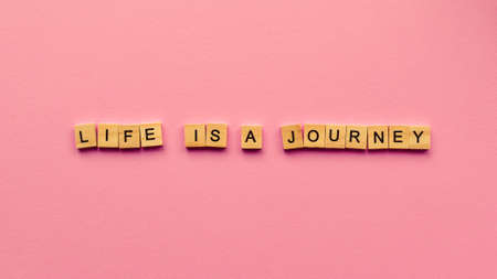 Words Life is a journey on a pink paper background. Motivating web banner.
