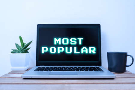 Text sign showing Most Popular. Business showcase Liked Followed Enjoyed by majority of the showing in a society Lap Top With Important Information On Table With Plant And Cup Of Coffee.