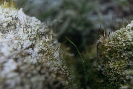 Enlarged ultra macro shot of nice cannabis trichomes on edge of a leaf from bud.