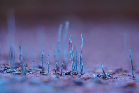 Morning dew froze on flower lawn and turned it into a white veil in the rays of sunlight