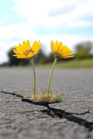 Two Bright Yellow Wildflowers Resiliently Growing Through a Crack in the Asphalt, Symbolizing Hope