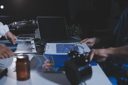Expert police officer examining American passport of a evidence bag in laboratory of criminology, conceptual image