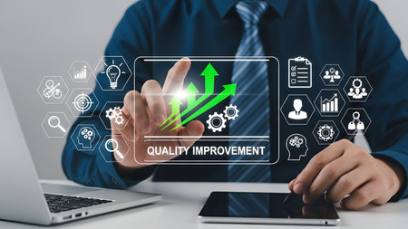 The a businessperson in a blue suit and tie interacting with a virtual screen displaying the phrase Improvement with green upward arrows and gears. The person is touching the screen with one hand while the other hand rests on a smartphone. Surrounding the central screen are various digital representing analytics, teamwork, innovation, and management. The background includes a laptop and a modern office setting, emphasizing a digital and futuristic business concept.