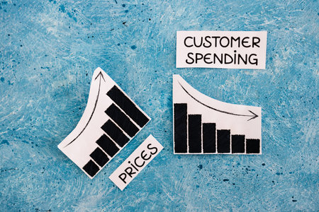prices going up and consumer spending going down conceptual image, graphs showing positive and negative growth with text