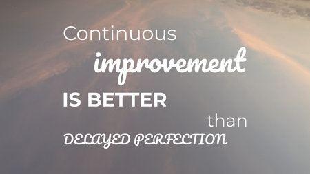 Quote is laid over a pastel-colored sky with wispy clouds. The text "Continuous improvement IS BETTER than DELAYED perfection" emphasizes the value of steady progress over waiting for an ideal outcome