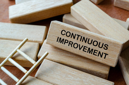 CONTINUOUS IMPROVEMENT text on wooden blocks on office desk representing ongoing process optimization and business efficiency