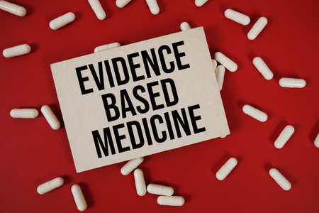 Evidence Based Medicine (EBM) text written on paper card with medicine capsule on red background
