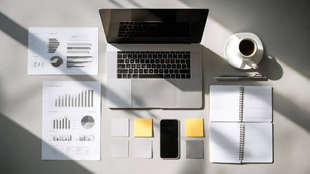 Two laptops with business analytics charts on screens sitting on office table surrounded by coffee cup, water glass, smartphone, documents