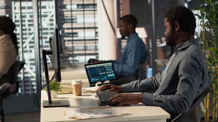 Black analyst working with monthly revenue balance to create financial plans using online tools, analyzing data infographics. Businessman managing organizational goals for efficiency. Camera A.