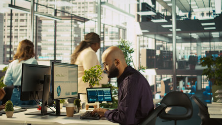 Arab office clerk working to hit key performance targets for revenue, profitability and operational efficiency. Middle Eastern employee at PC desk doing research analysis, camera B
