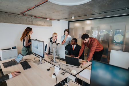 Team collaboration in a modern office environment with diverse business professionals brainstorming solutions together