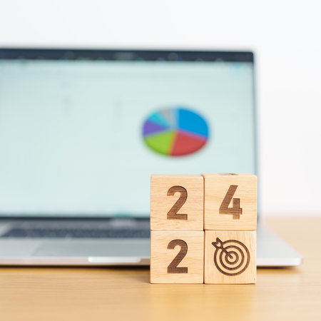 2024 Year block with dartboard icon against computer laptop background. Goal, Target, Resolution, strategy, plan, Action, mission, motivation, and New Year start concepts