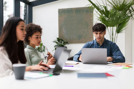 Five office colleagues discussing annual data at conference table, with laptops and progress chart. Collaboration, teamwork, business, professional, modern, innovation, strategy