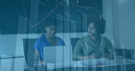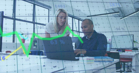 Image of statistical data processing over diverse man and woman discussing over laptop at office. Computer interface and business data technology concept