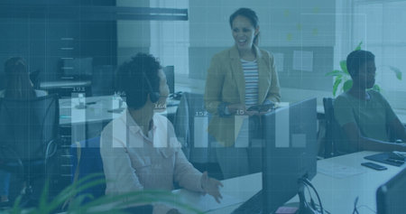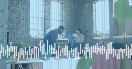 Image of data processing over business people in office. Global computing, finance, business and data processing concept digitally generated image.