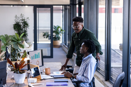 Mid adult African American man leaning against desk in open office with laptop, coffee, copy space. Professional, workspace, technology, productivity, modernity, collaboration, analysis
