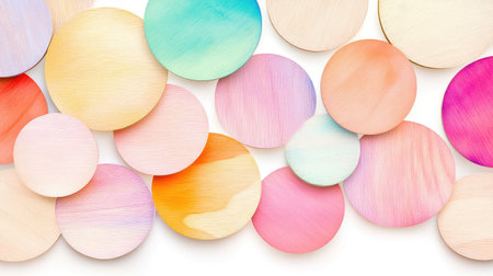 A visually appealing arrangement of colorful wooden circles in soft pastel shades, perfect for creative design projects and artistic expressions.