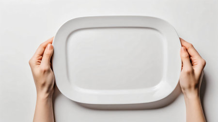 A clean and minimalist composition featuring two hands gently holding a plain white plate against a bright, neutral background. Perfect for concepts related to food, dining, minimalism, or tableware. Ideal for use in advertising, blogs, or editorial content