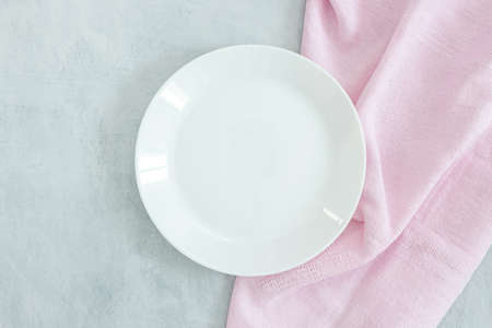 Empty ceramic plate and kitchen striped towel on light stone concrete table background. Copy space. Menu Recipe Concept. Top view. Flat lay. Banner for design, website