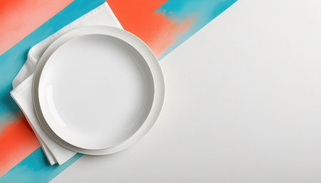 A minimalist white plate rests on a colorful background of vibrant yellow, pink, and blue, ideal for showcasing modern dining concepts or artistic food presentations.