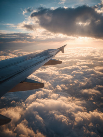 The airplane wing extends above soft clouds with light shining through, creating a feeling of anticipation for new adventures in the sky.