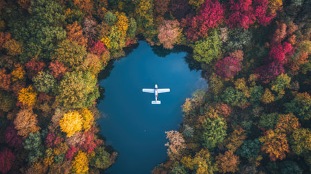 An aerial view captures a small plane resting on a tranquil lake, surrounded by a vibrant autumn forest, showcasing stunning seasonal colors in nature.