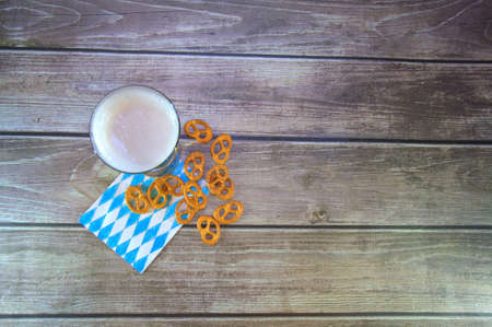 A glass of light beer on a traditional napkin and several salty pretzels on a wooden table, top view. Close-up.