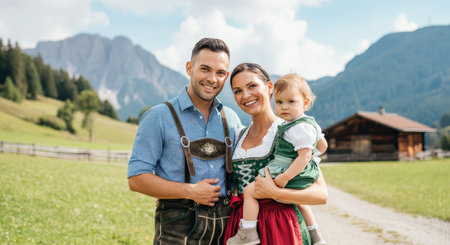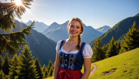 A smiling woman in a traditional Bavarian dirndl stands in a picturesque alpine meadow, surrounded by mountains and trees.