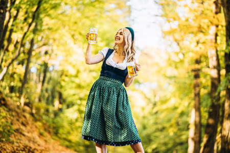 Pretty happy blonde in dirndl, traditional festival dress, holding two mugs of beer outdoors in the forest with blurred background. Oktoberfest, St. Patrick’s day, international beer day concept.