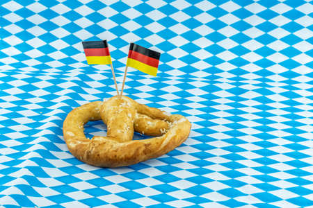 tasty pretzel symbol brewing holiday oktoberfest on white and blue rhombus pattern bavaria