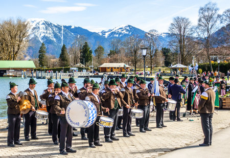BAD WIESSEE, GERMANY, APRIL 2: typichal local bavarian brass and marching band in front of the tegernsee lake in bad wiessee on april 2, 2018