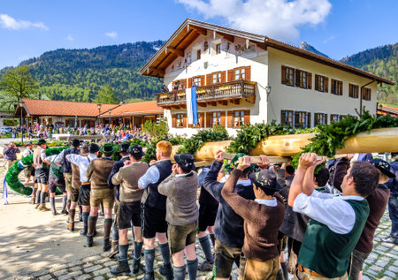 Kreuth, Germany - May 1: A traditional maypole is being set up by the local bavarians during the typical May Day festival on May 1, 2019 in Kreuth in Germany.