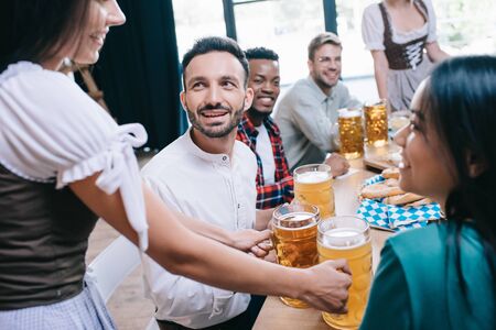cropped view of waitresses in traditional german costumes serving beer for multicultural friends in pub